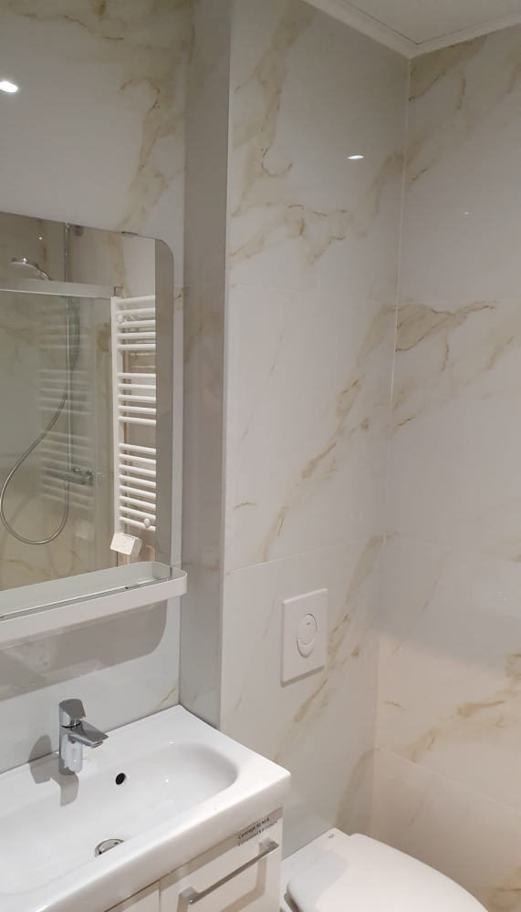 Nous utilisons des matériaux de haute qualité, que ce soit pour la faïence, les revêtements muraux ou les sanitaires, afin de garantir une finition soignée et durable. Notre savoir-faire nous permet de créer des aménagements personnalisés, adaptés à vos besoins et à l’espace disponible. Que vous ayez besoin d'une rénovation complète ou d’une simple mise à jour de certains éléments (carrelage, baignoire, douche, lavabo…), nous vous offrons un service clé en main, en respectant les normes de sécurité et d’étanchéité les plus strictes.